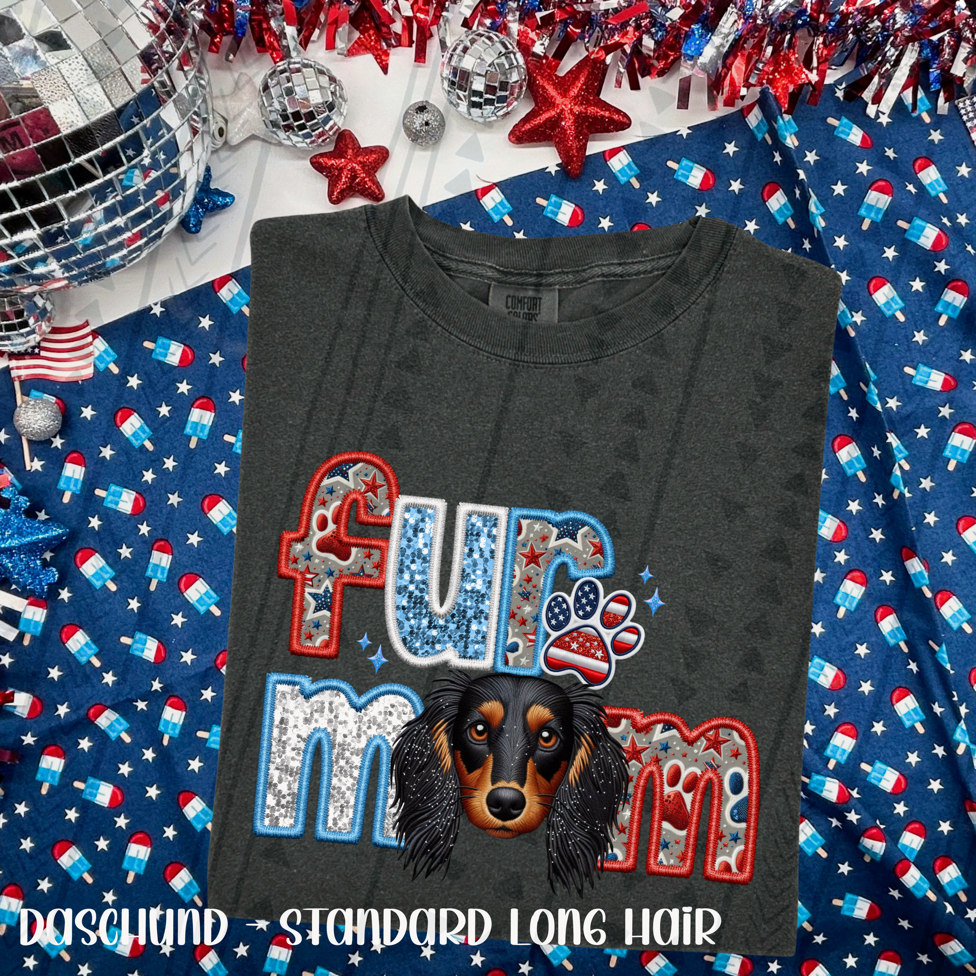 Patriotic Fur Mom - Long-Haired Daschund (Black/Brown) DTF Transfer